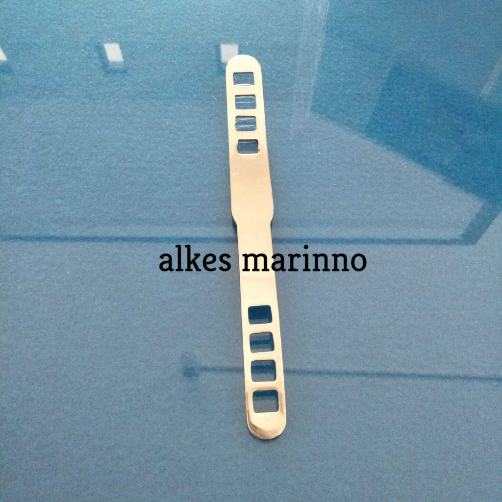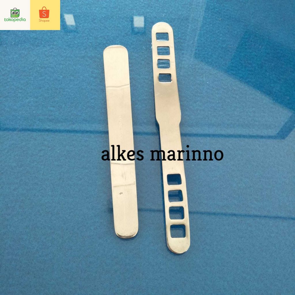 - Jenis Tongue Spatel Stainless Lubang. Material yang digunakan dalam pembuatan alat Tongue Spatel Stainless Lubang ini adalah dari alumunium logam yang memiliki sifat elastis atau lentur sehingga bisa di lengkungkan sesuai dengan anatomi rongga mulut.Alat Tongue Spatel Stainless Lubang memiliki 8 lubang. 4 pada sisi kiri dan 4 lubang lain pada area kanan. Lubang tersebut nantinya akan berperan sebagai pegangan anti slip dan sebagai ruang untuk melihat objek yang di periksa oleh dokter tersebut.
