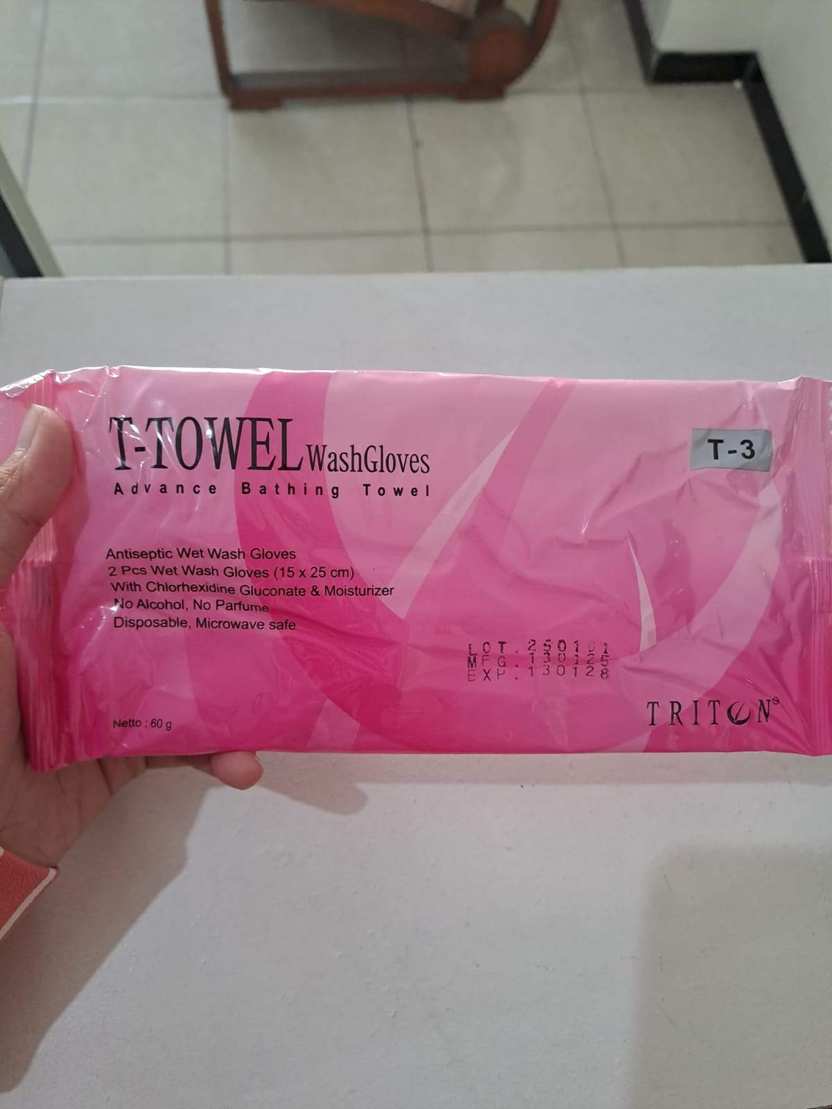T-Towel adalah produk berupa sarung tangan handuk sekali pakai yang digunakan untuk membersihkan tubuh, terutama bagi pasien yang tidak bisa mandi secara konvensional atau saat bepergian (traveling). Produk ini mengandung antiseptik dan pelembap, serta tidak mengandung alkohol dan pewangi sehingga aman untuk kulit.